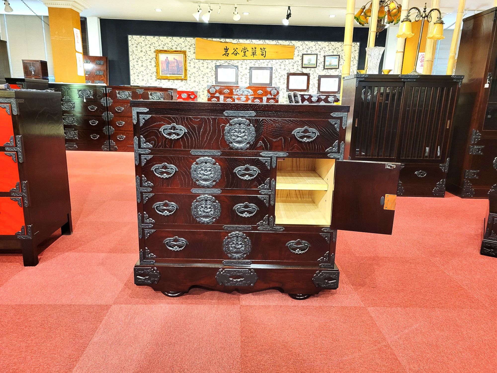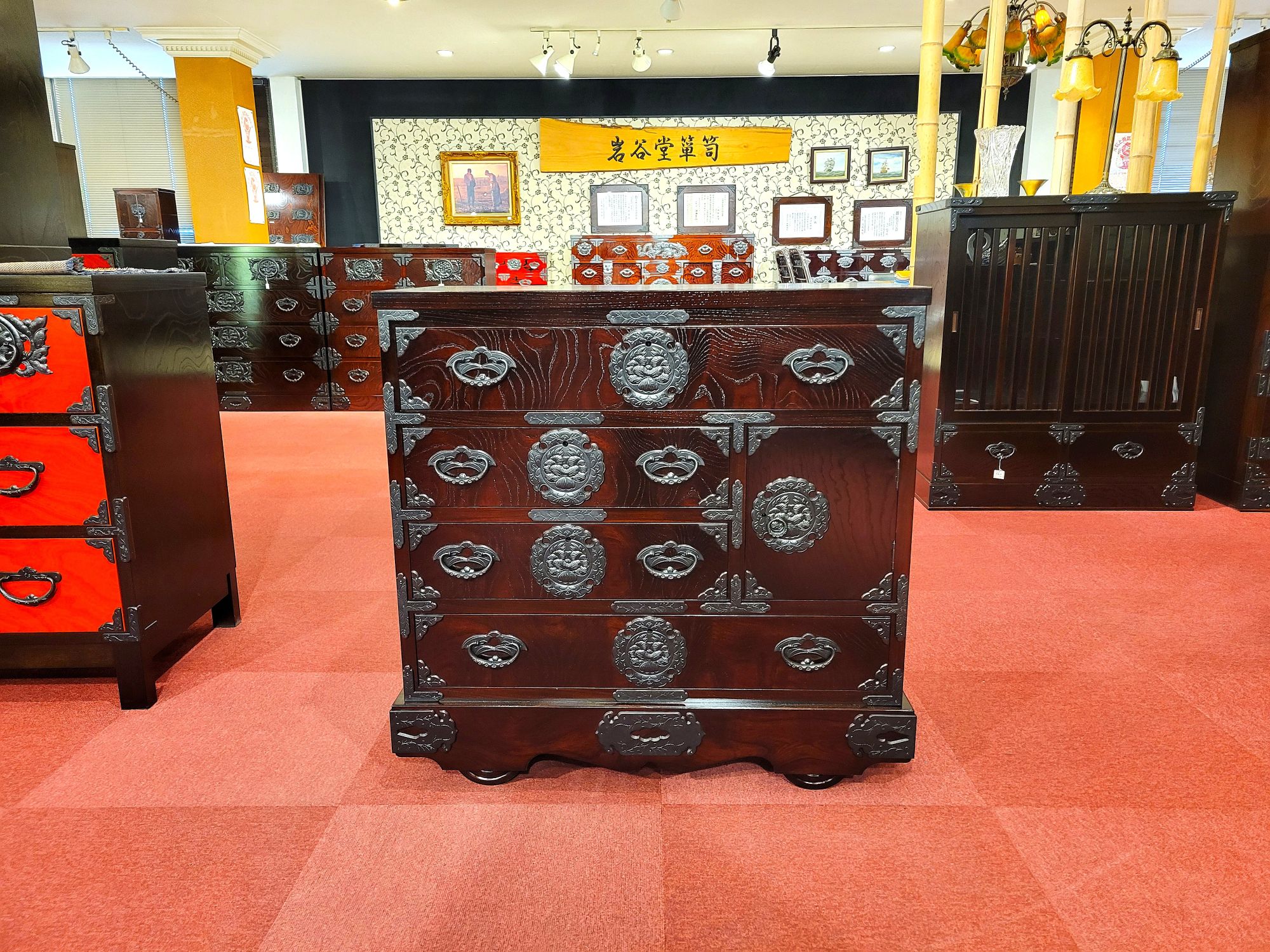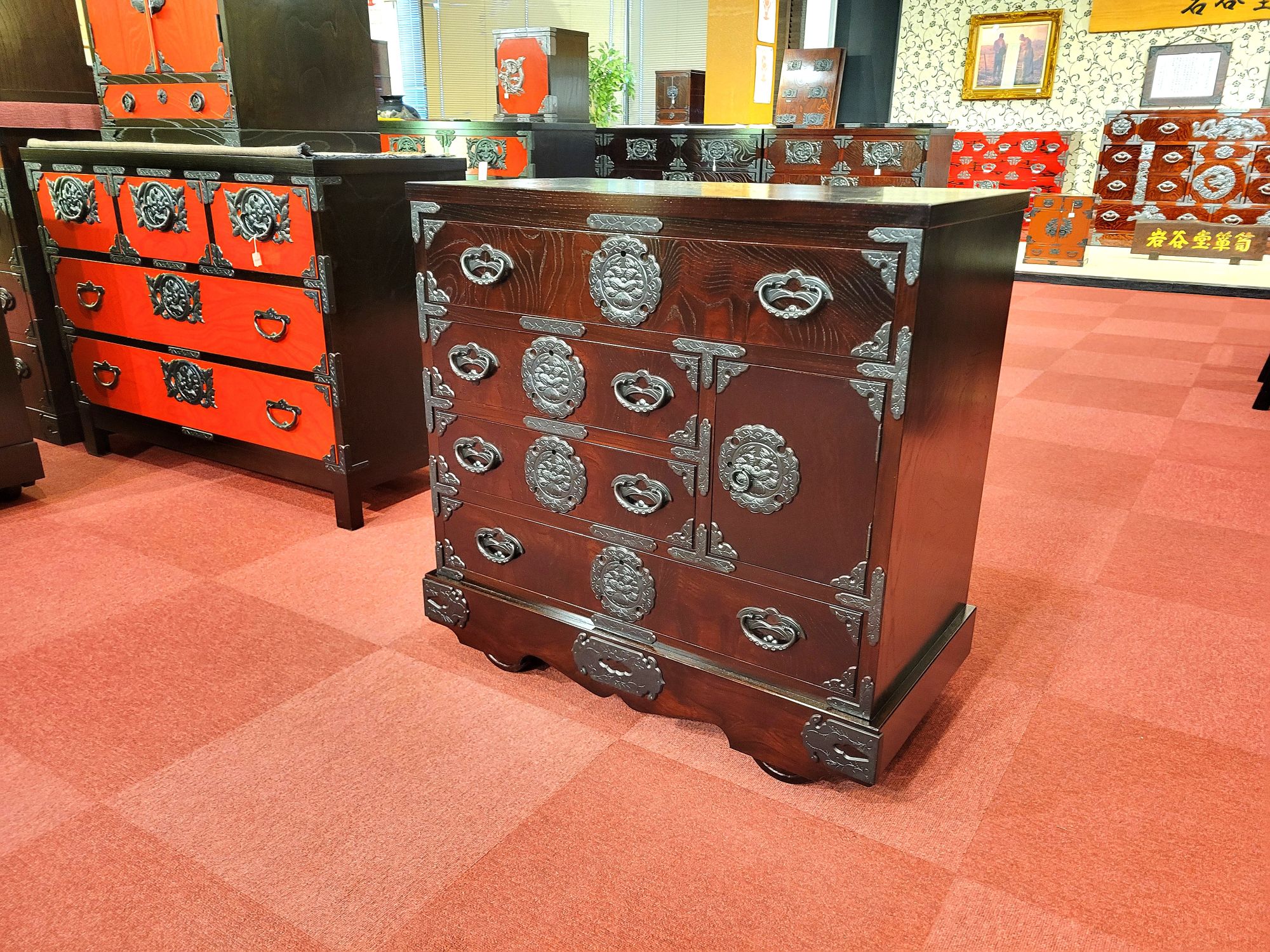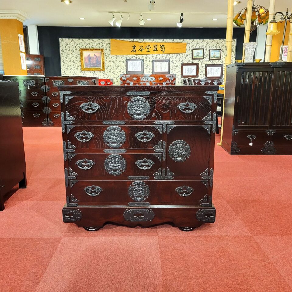 サイズ(単位mm) W800 x D420 x H780 拭き漆塗り 南部鉄器金具 新丸ボタン *新規入荷分より金具が少し変わります。