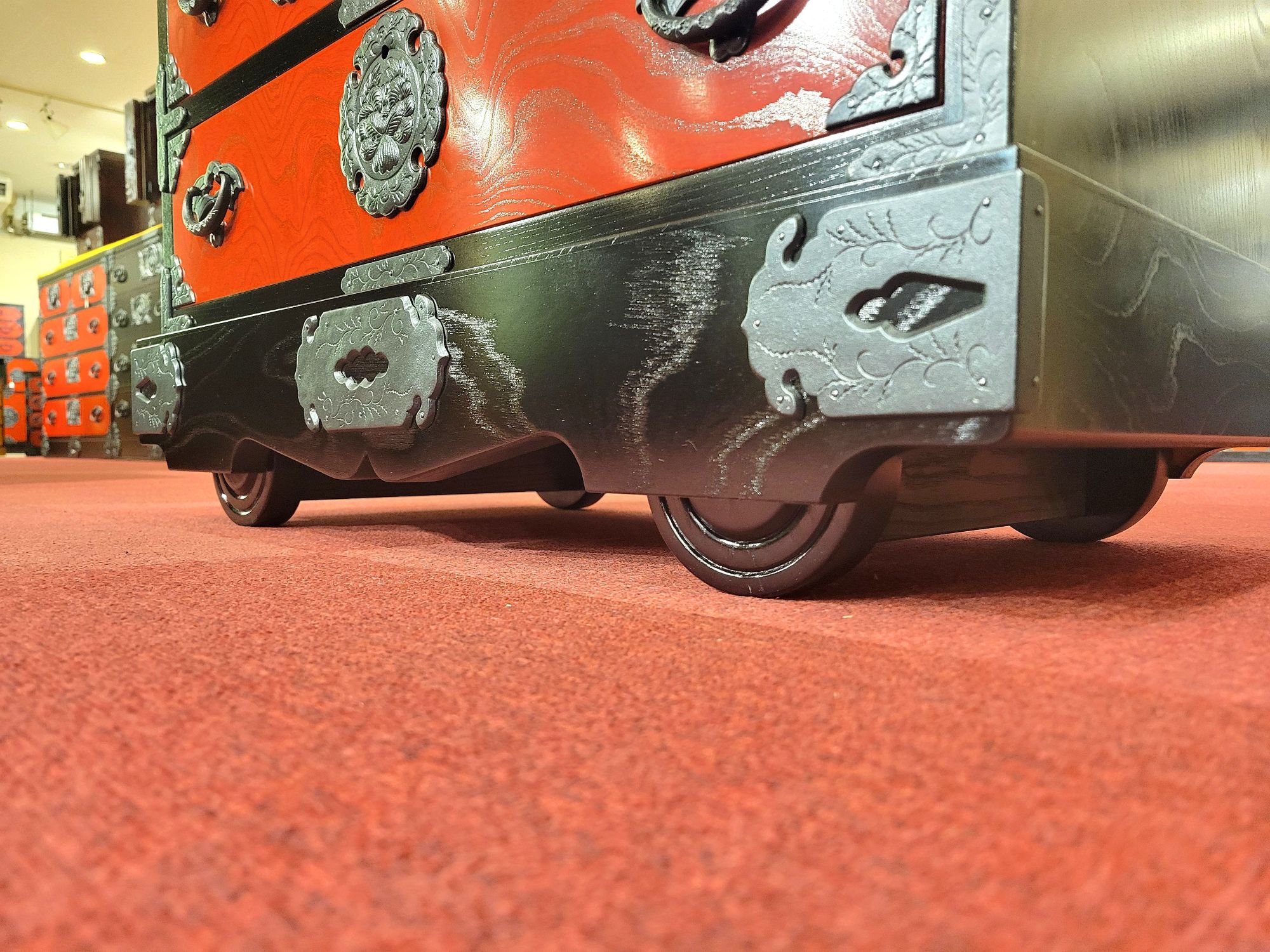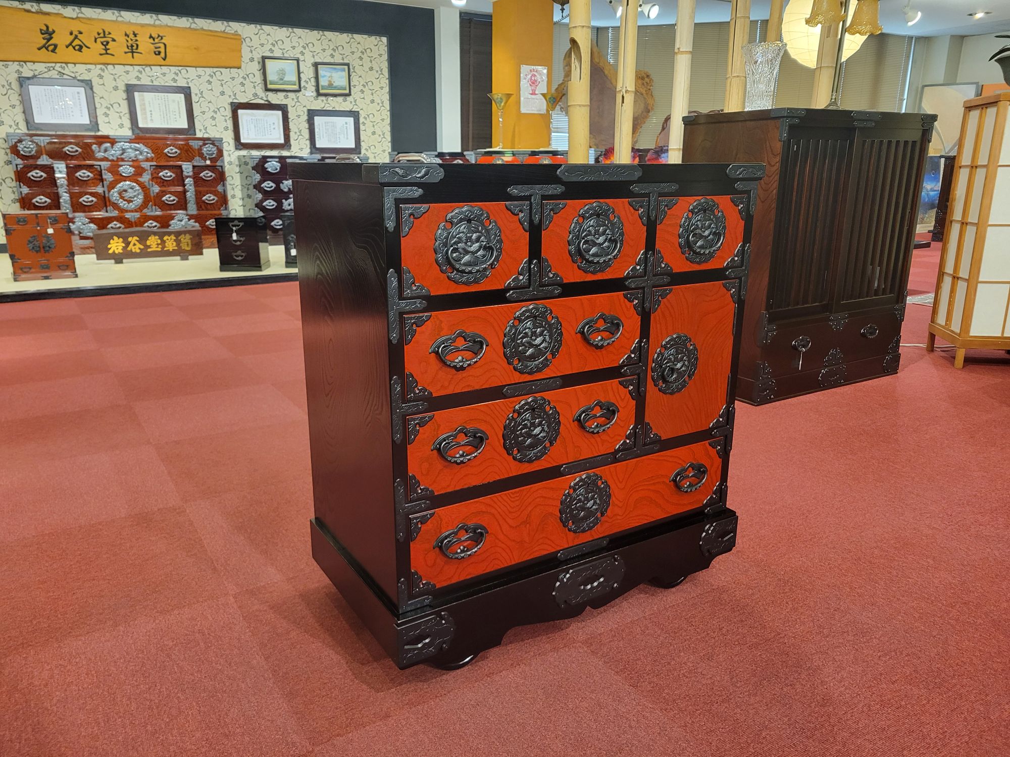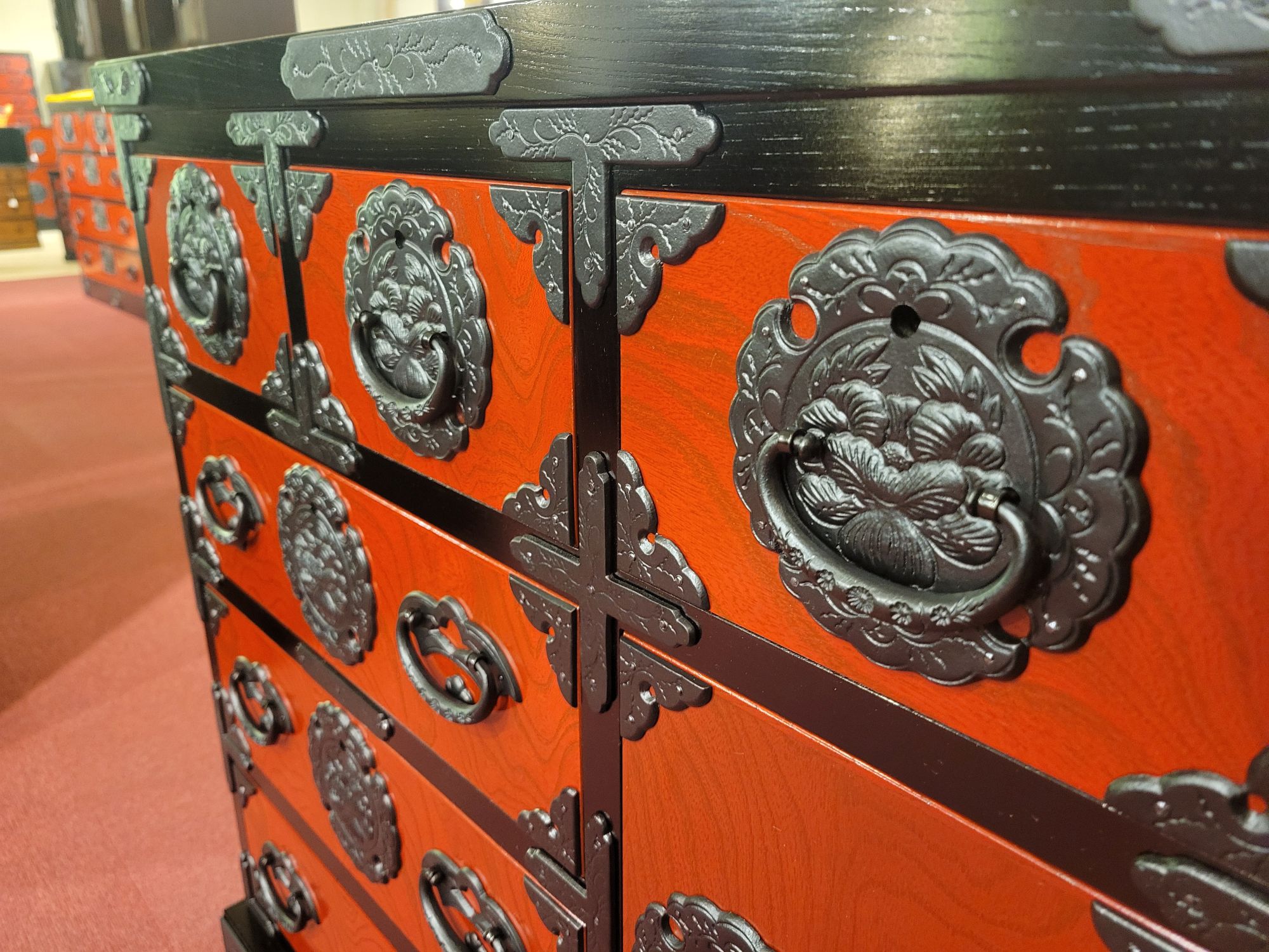サイズ(単位mm) W760 x D410 x H840 拭き漆塗り 赤黒 南部鉄器金具 牡丹