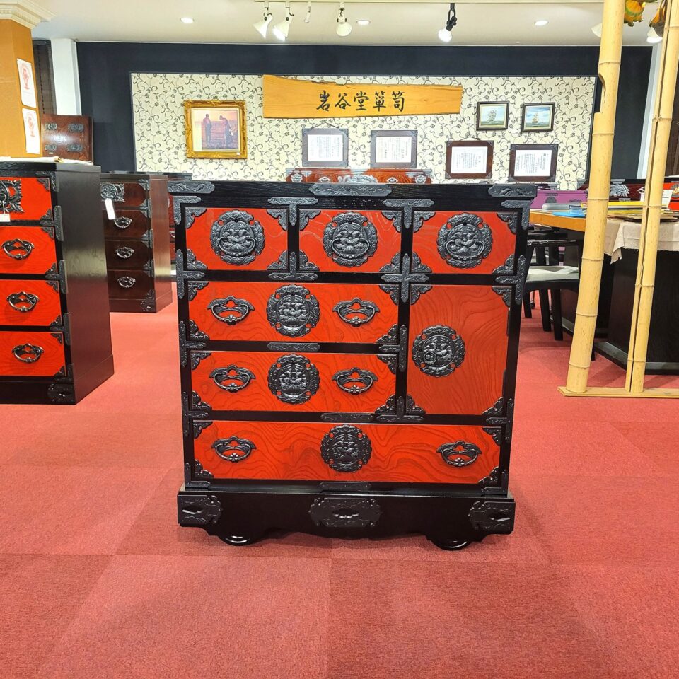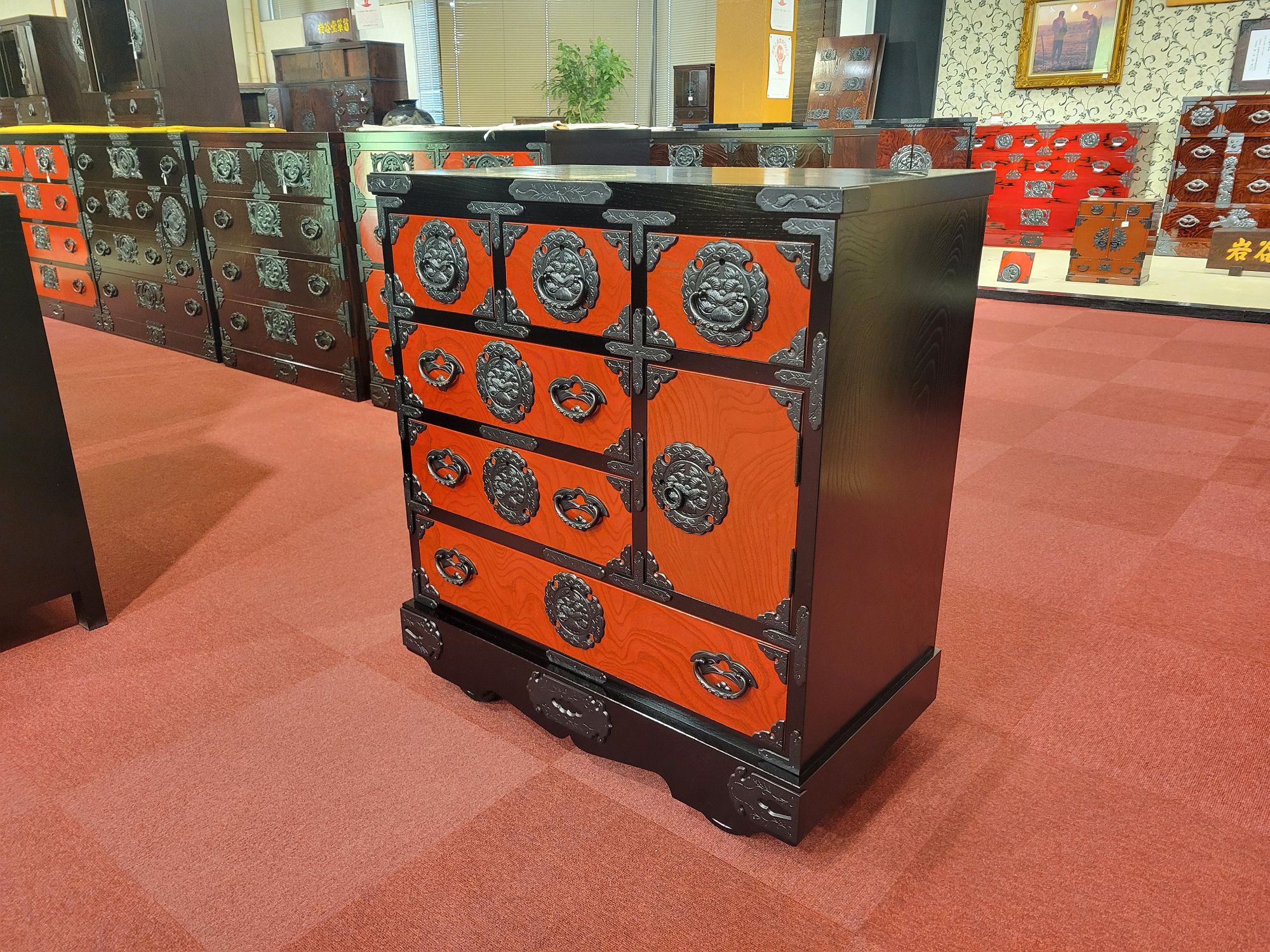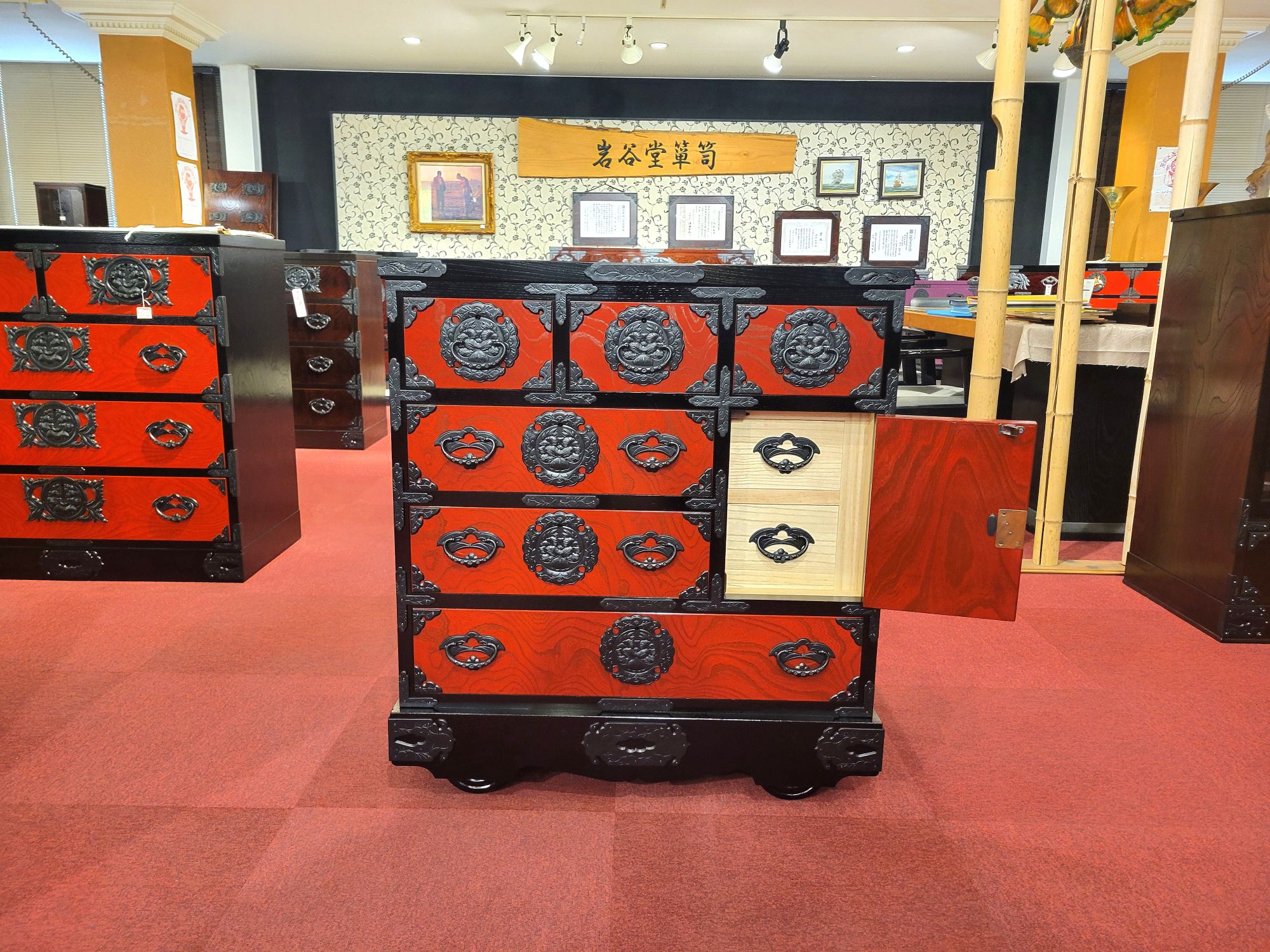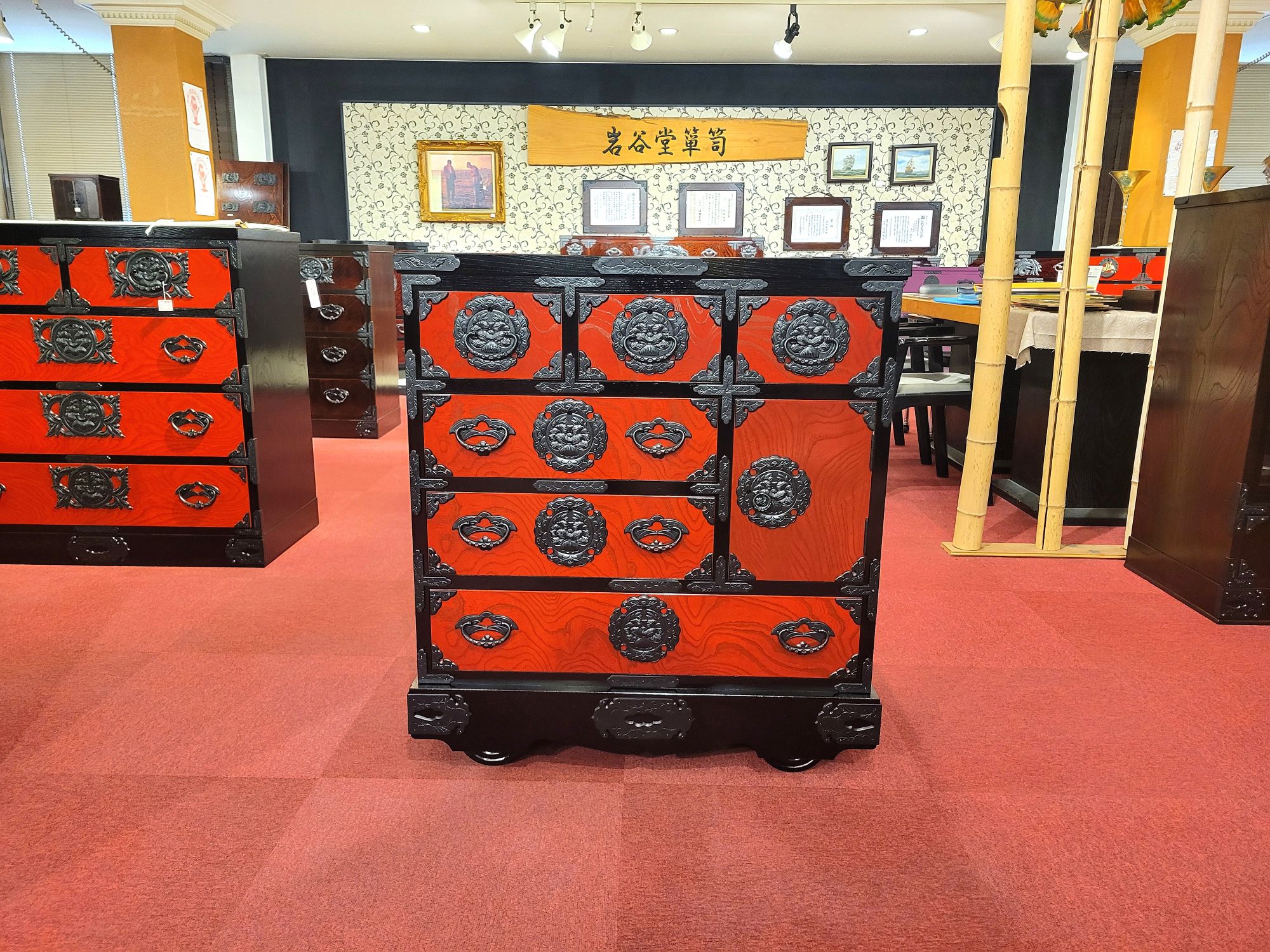サイズ(単位mm) W760 x D410 x H840 拭き漆塗り 赤黒 南部鉄器金具 牡丹