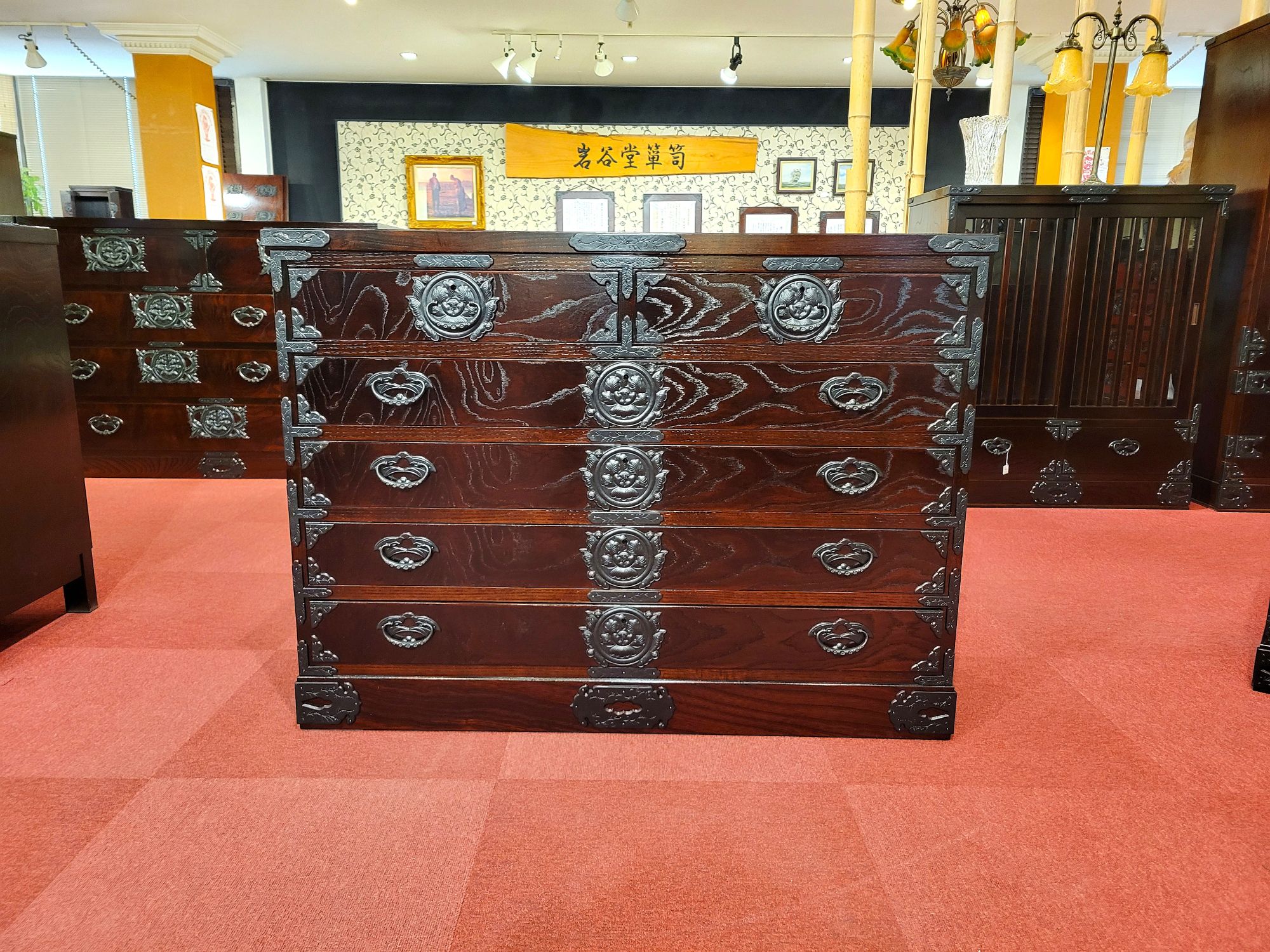 サイズ(単位mm) W1050 x D450 x H780 拭き漆塗り 南部鉄器金具 牡丹(小) オーダー特注は、お問い合わせ下さい 0120-630-200